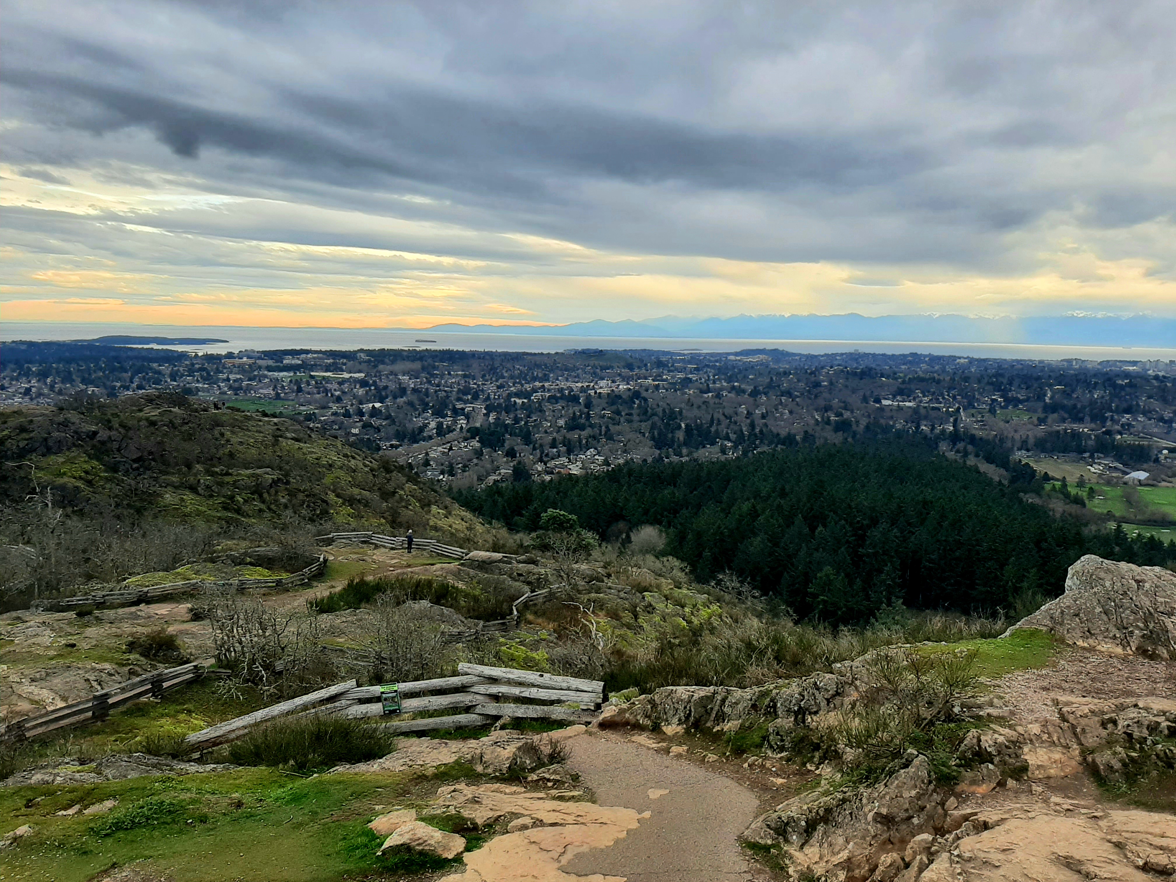I recommend climbing to the summit of this mountain first, as it’s shorter in height between two. The view at the top offers a spectacular vantage of Victoria itself with the Salish Sea and Olympic mountains providing a beautiful backdrop. This is a popular spot among locals, and for good reason. When you’re here you get to take in the views, experience an awesome photo opt, nature walk, and even have a chance to read a sun dial if you like.